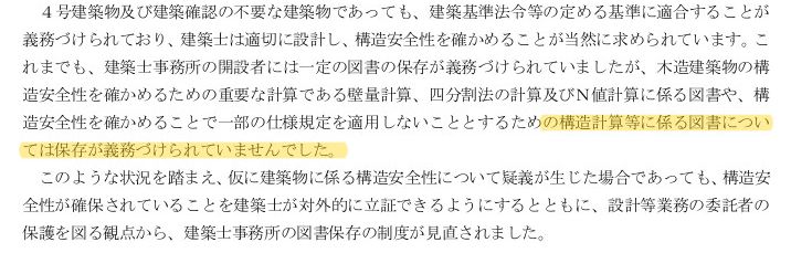 もともと、建築設計者には、建築に関わる図面を一定期間保管しておく義務がありますが、その保管図書に構造関係図書、例えば仕様規定といわれる四分割法、N値計算の資料、許容応力度計算などの構造計算の資料が加わっただけです。