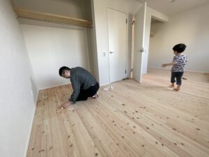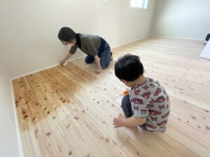 大阪狭山市で建築中のT様邸にて、先日、施主様と一緒に床材のワックスがけをしてきました。