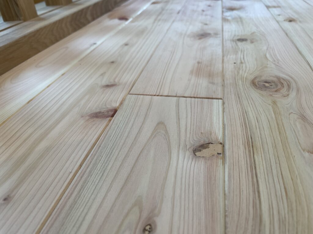1階はすでにオイル仕上げされたバーチ材、2階は無塗装の桧材に。