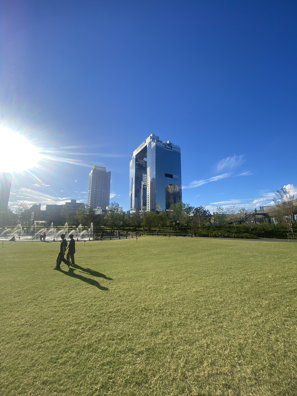都会の真ん中にこれほど大きな緑地があること自体が驚きで、小さな子供たちを連れた家族や、芝生の上でリラックスするカップル、あるいは大阪を訪れた観光客の方々など、多くの人々が自由に時間を過ごしています。
