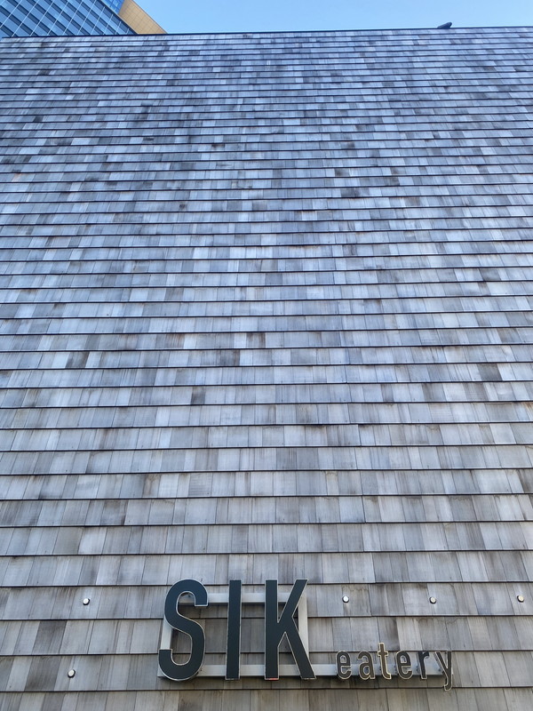 スロープを降り切ったところにあったカフェは木の外壁仕上げ。