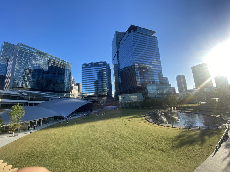 ビルとビルの谷間にできた天然芝の広場はきれいに手入れがされていて、歩いていてもとても気持ちがいい。芝生広場の奥には人工池が見て、たくさんの子供たちが水浴びをしていました。
