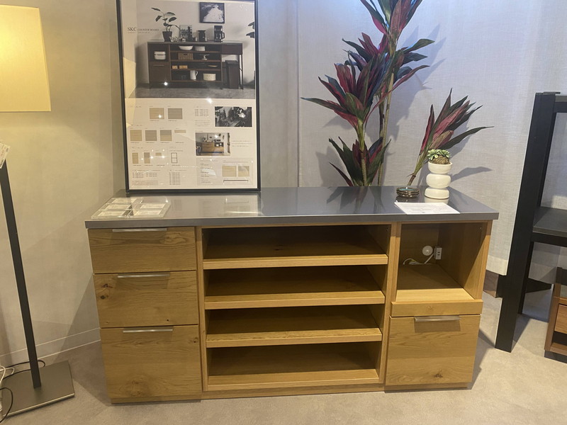 リーフではあまり扱いませんが、メラミン合板を使用したお手入れのしやすいカップボードが沢山並んでいました。