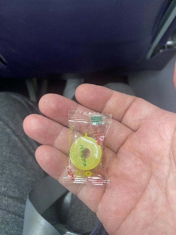 機内に入るときに運航遅れのお詫びの品で渡されたのはパインアメ(笑)