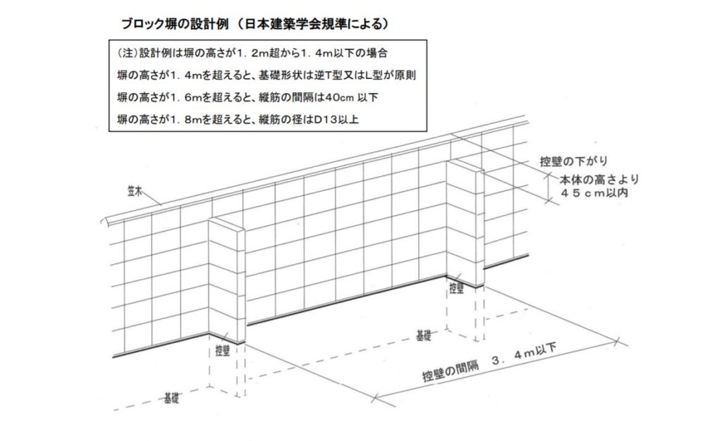 「1.2mを超える高さのコンクリートブロックは3.4mごとに控え壁を設けること」