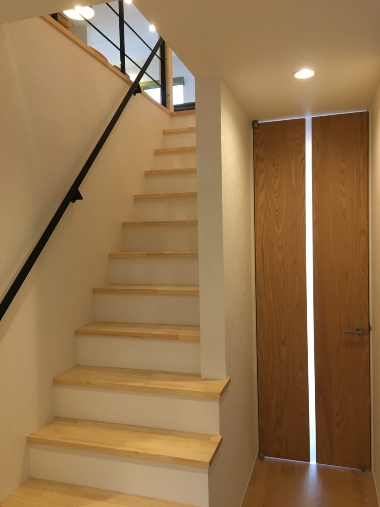 玄関から、オークのスリット窓付のドアを開けると2階への階段が。