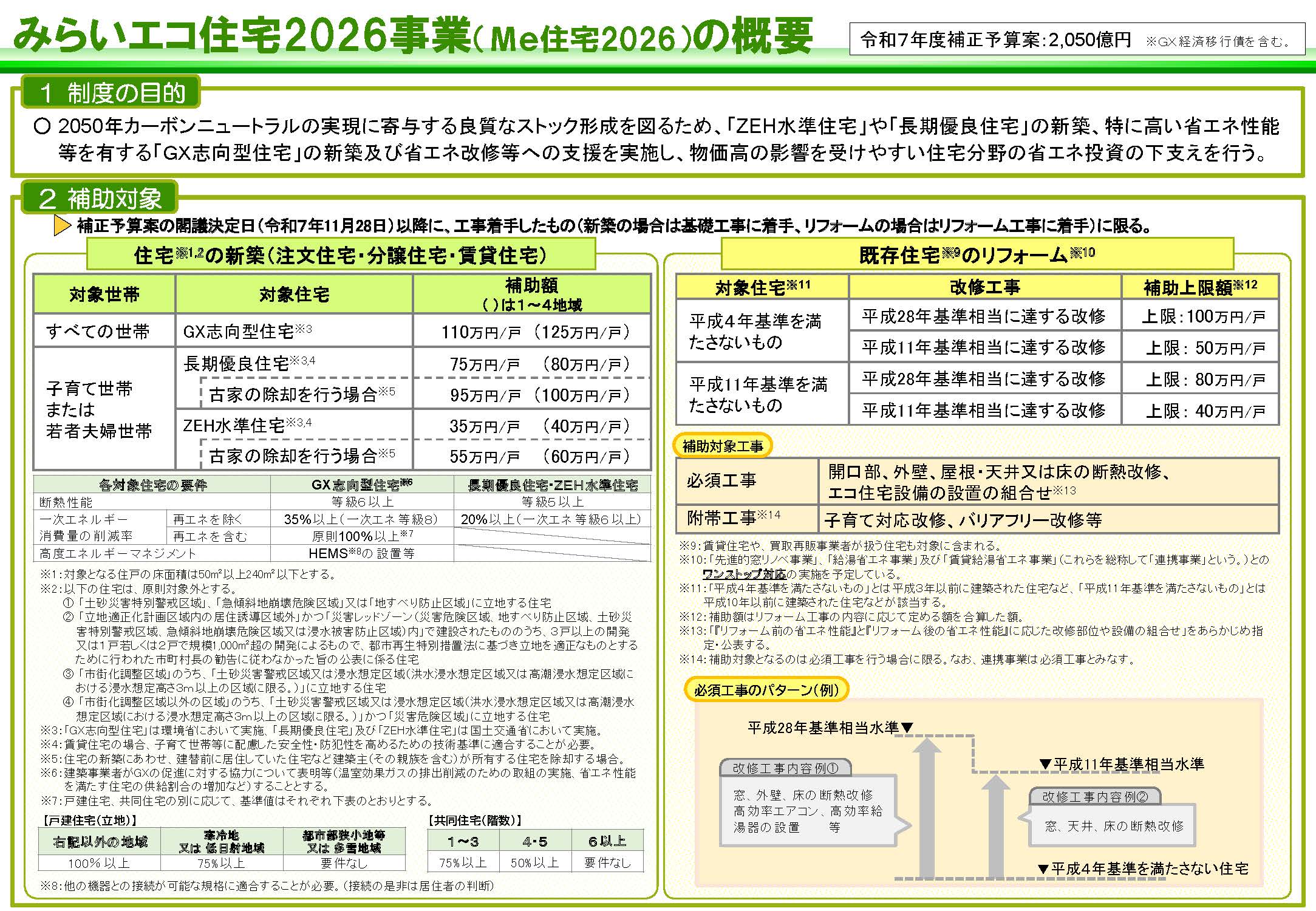 リフォームに関しては断熱改修やエコ設備導入を必須条件に、子育て対応、バリアフリー化の工事に補助金が支給されます。