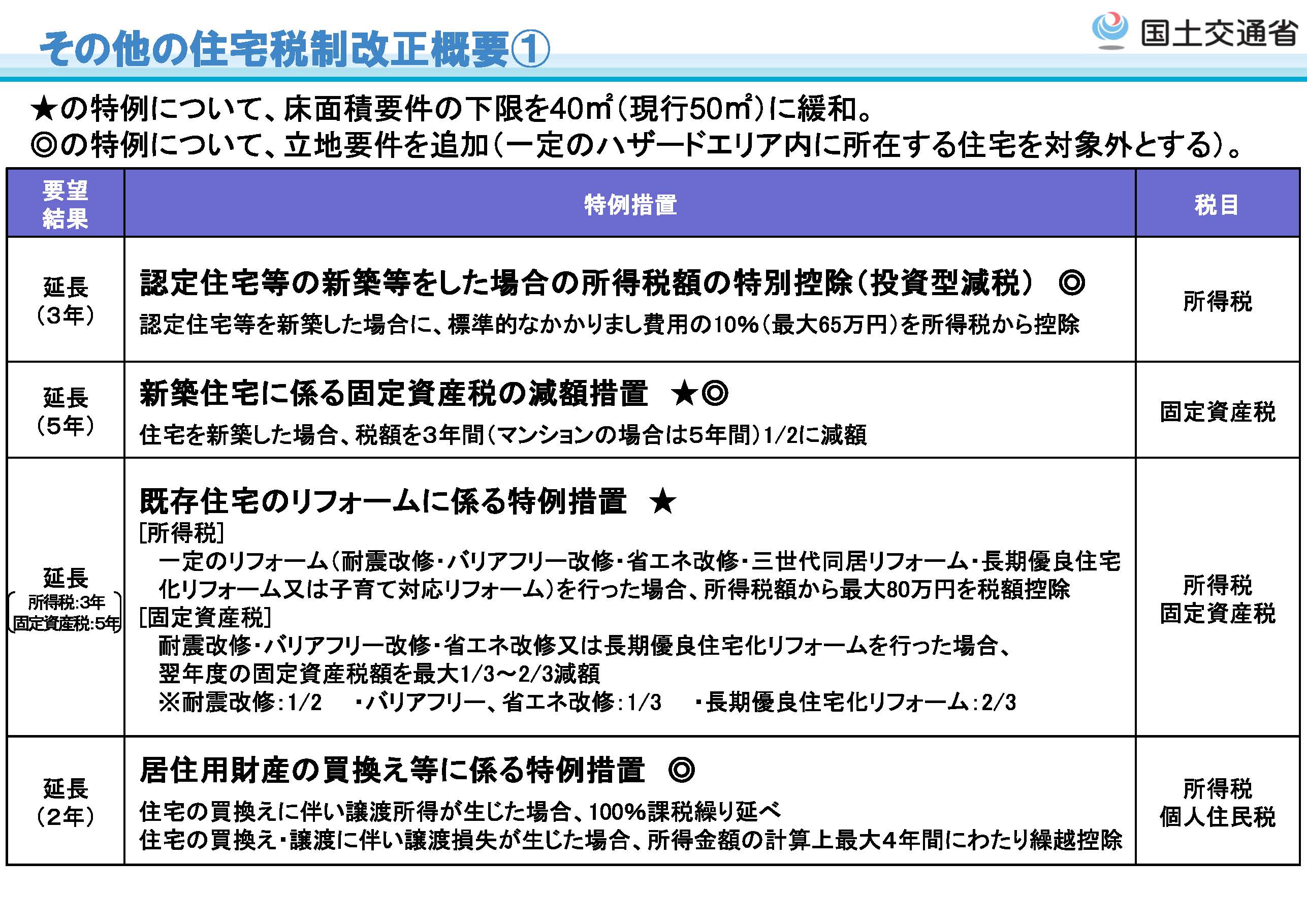 今まで適用対象外だった床面積要件が緩和(50㎡から40㎡へ)されている措置が多いのが目立ちます。