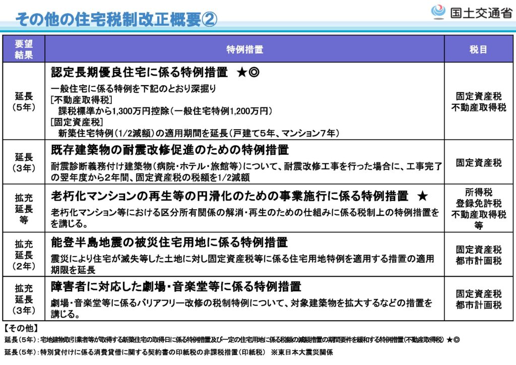 住宅ローン減税以外にも、住宅関連の税制改正が沢山あります。多くは2025年までだった特例をさらに延長させたものです。