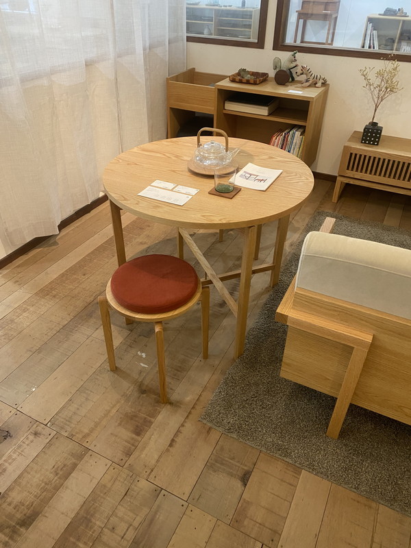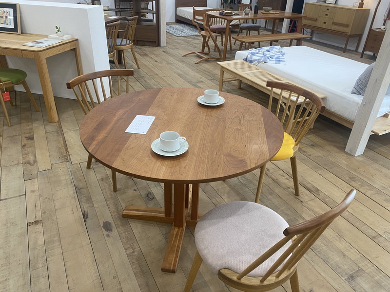 そしてリーフの展示品の中でも一番人気の丸テーブル。脚の形状が1本タイプなので360度どこからも椅子を置けてとても便利です。完成見学会でもよく利用しています。
