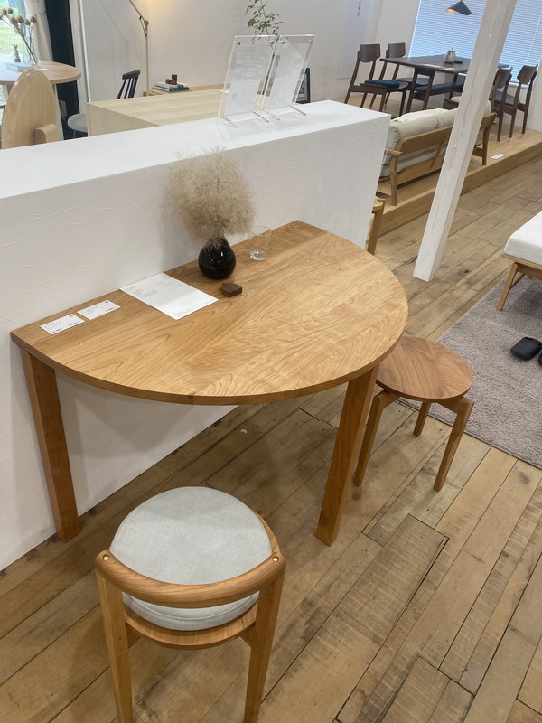 この半円テーブルもその一つ。2人暮らしまでだったらこのサイズでも十分です。質感もあり、デザインもシンプルでマンションなどの空間にも溶け込みそうです。
