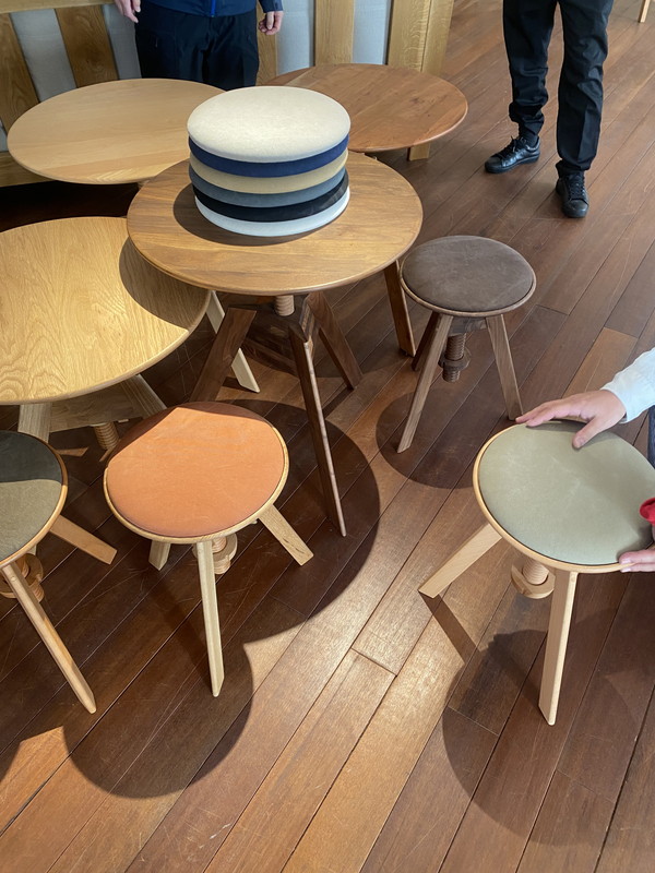 朝早めにホテルを出て、昨夜、レセプションパーティーでお世話になった広松木工さんのショールームへ。昨夜はほとんど展示家具を見れなかったのでじっくりと見学させていただきました。こちらはクルクル回すと高さが変えれるテーブルとスツール。スツールの座面は簡単に取り外し出来て、色も何色も用意されています。