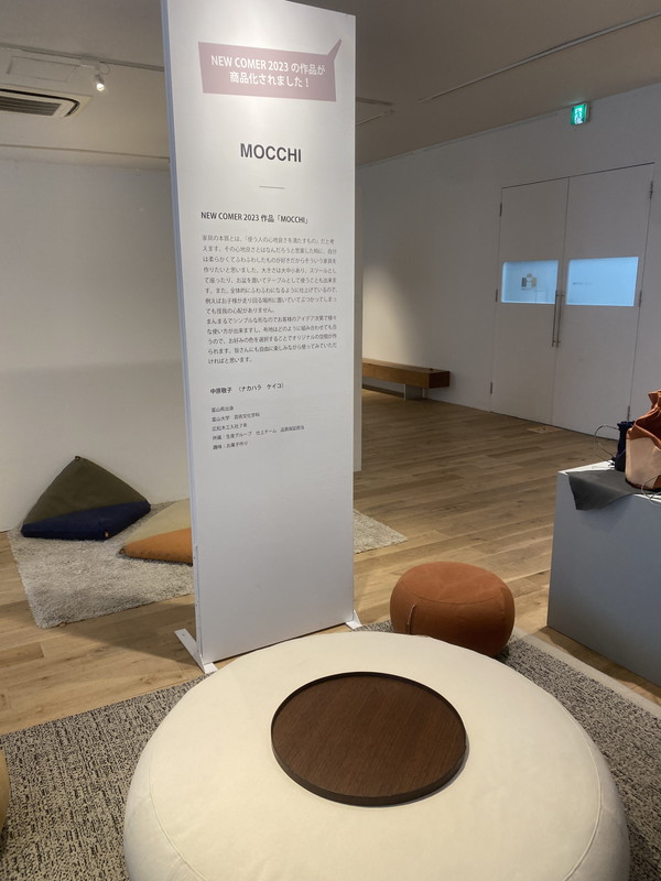 同じく、グランプリを受賞して、実際に商品化された作品「MOCCHI」。丸いお餅のようなデザインでサイズも3種類。小さいサイズはスツールに。大きいサイズはテーブルに使えたり、複数人が座れる椅子になったり。とても可愛らしいデザインです。