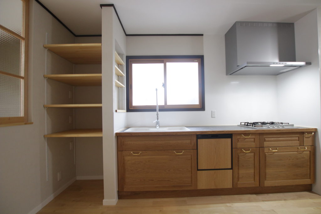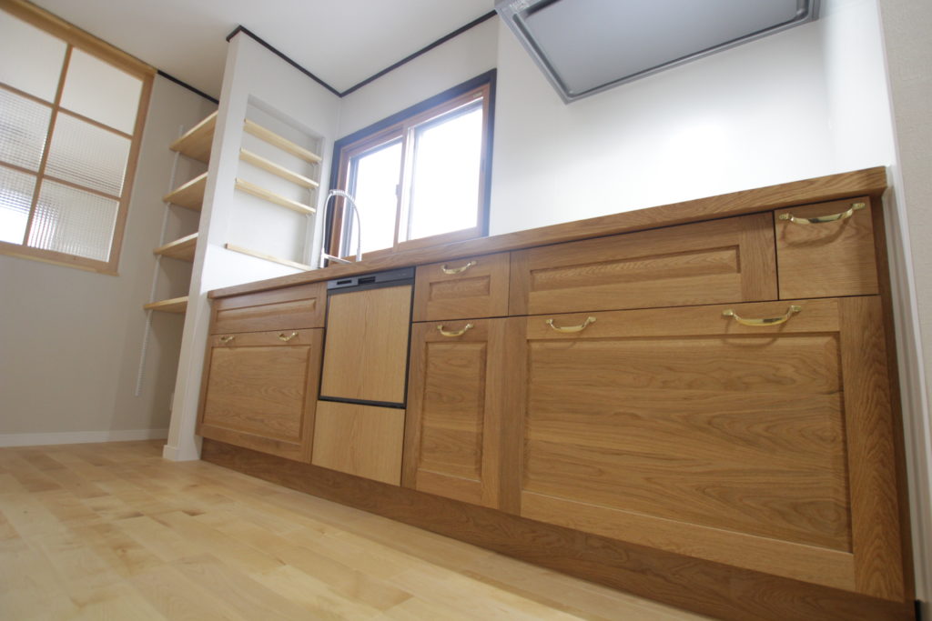 リーフオリジナルの天然木オーク材のキッチンを入れさせていただきました。