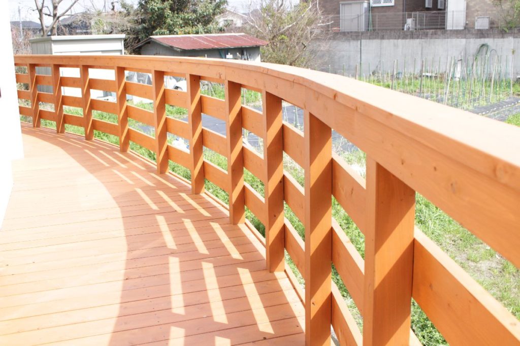 手すり壁も完成した天然木ヒノキ無垢板製のウッドデッキ。
