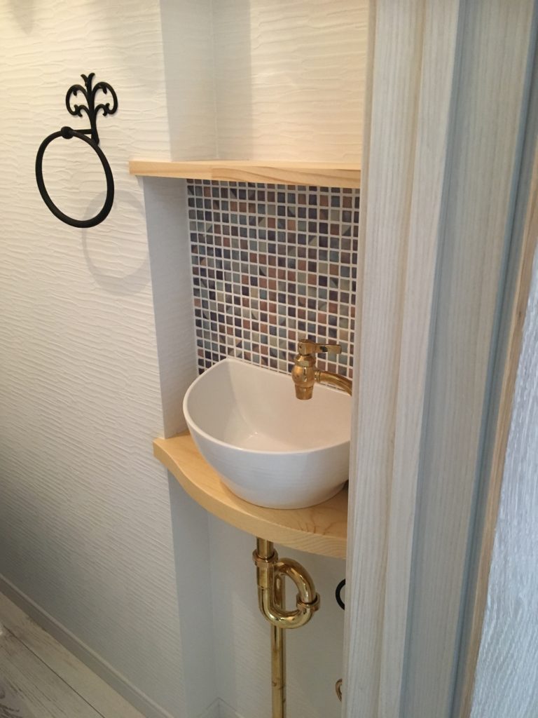 トイレの中にはニッチを設けて可愛い洗面ボウルを設置。