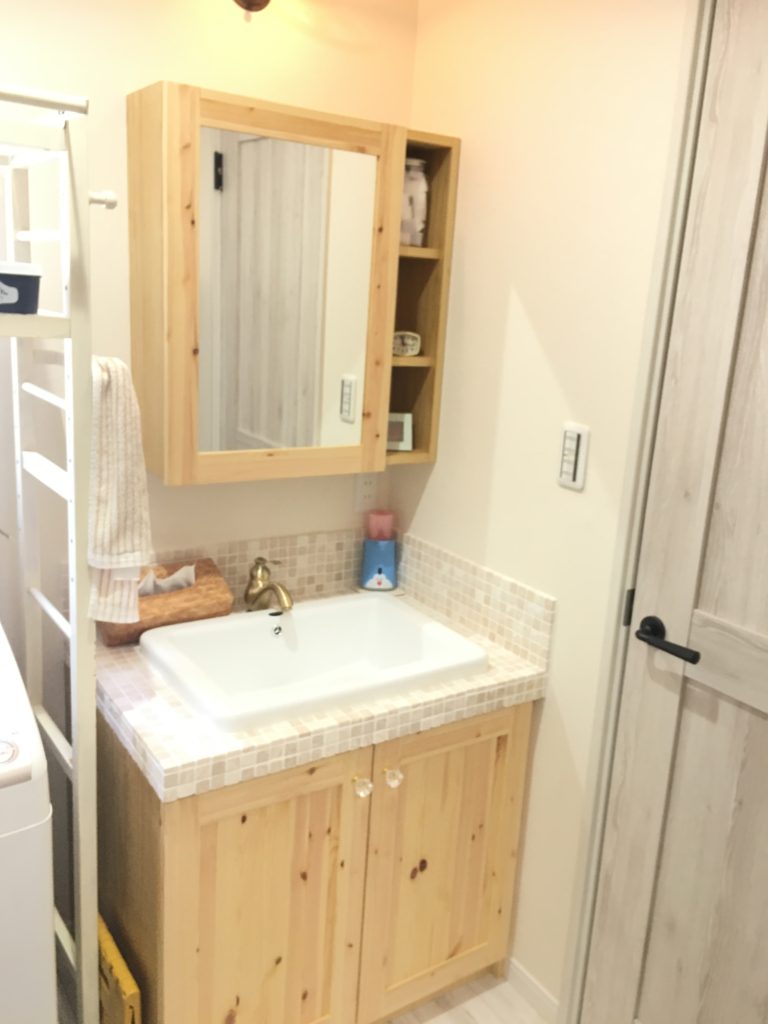 真鍮製の水栓金具やパインの天板ととてもよく似合う壁になりました!