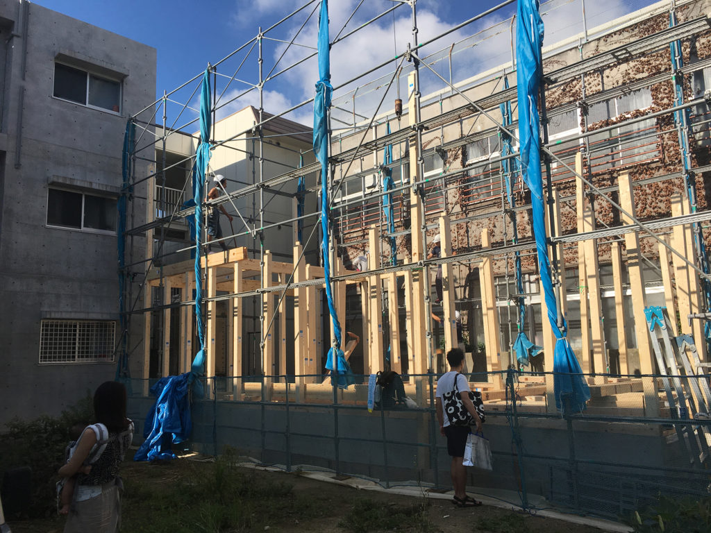 上棟時にはお手伝いの大工さんも駆けつけてくれ、総勢6人で行いますのであれよあれよという間に建物の形が出来上がってきます。