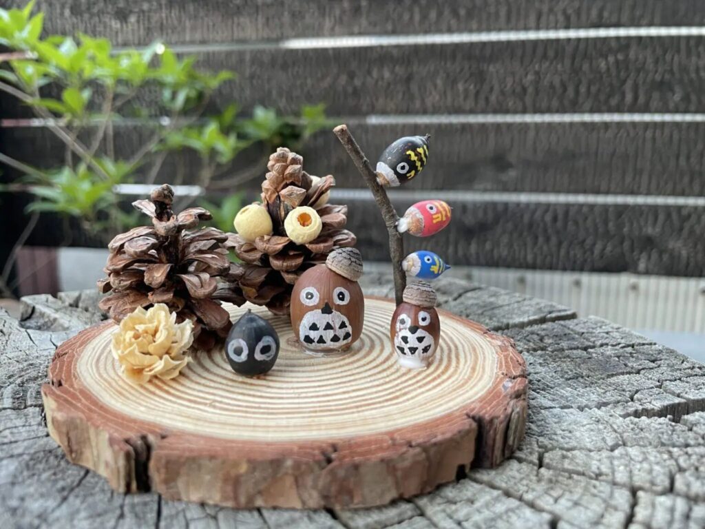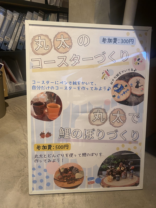 コースター作りとは別に、輪切りにされた丸太とどんぐりを使った鯉のぼり製作など、