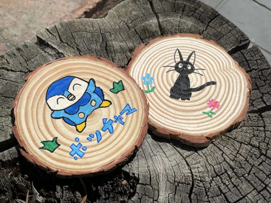 とは言っても、丸太をすでに輪切りにしてあるものに絵を描いていただいたり、