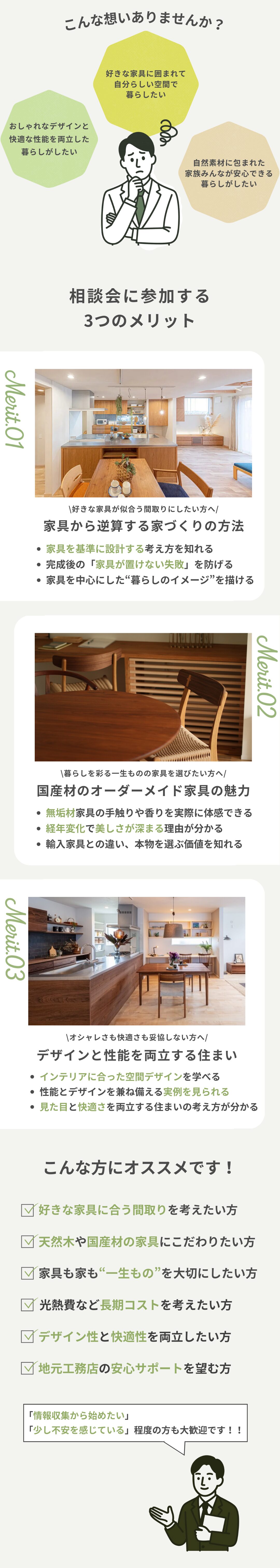 この相談会では、家具から考える住まいづくりの魅力を知り、ご家族にとって本当に心地よい住まいの形をイメージしていただけます!