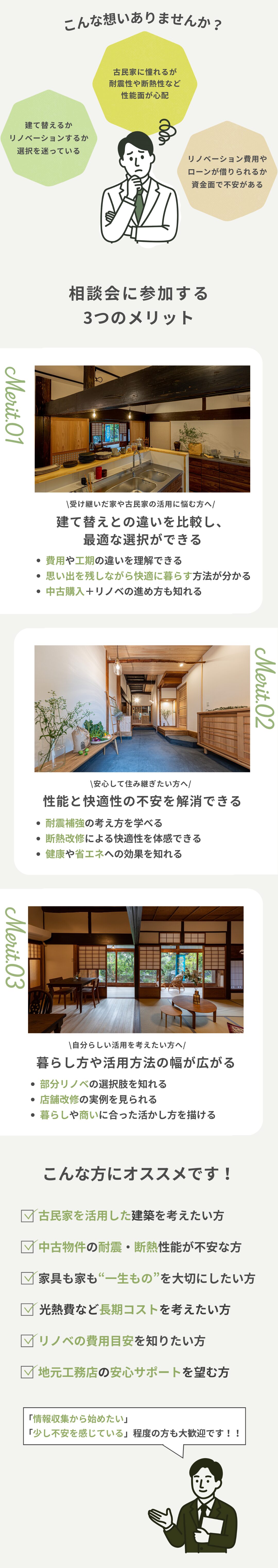 時を重ねてきた梁や柱、そこに刻まれた家族の思い出。古民家は、活かし方次第で“住む家”にも“魅せる店”にも生まれ変わります。耐震・断熱改修で快適さを備えつつ、木のぬくもりや趣を残すことも可能です。本相談会では、資金計画や実例を交えながら、古民家再生の魅力をお伝えします。