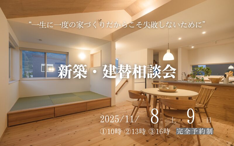 この「新築・建替え相談会」では、新たに土地を取得して新築をするか、ご実家を建替え、リノベーションするかをお悩みの方への相談会です。