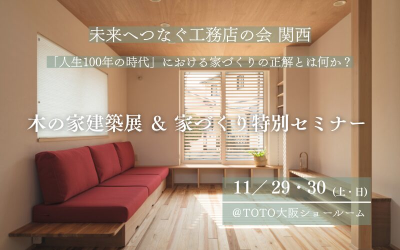 主催は一般社団法人 未来へつなぐ工務店の会 関西(略称 みらつぐ関西)。地域の生活者が家づくりで失敗しないための情報提供やセミナーの開催、相談支援等を行っている民間機関です。「地域のため、よい家を未来に残す」ことをテーマに活動している『みらつぐ関西』。当会の基準で選ばれた、優れた工務店だけが一堂に集まる『木の家建築展』の参加者は、これまで延べ500名以上(※関西以外での開催を含みます)。毎回多くの方々に来場いただいています。